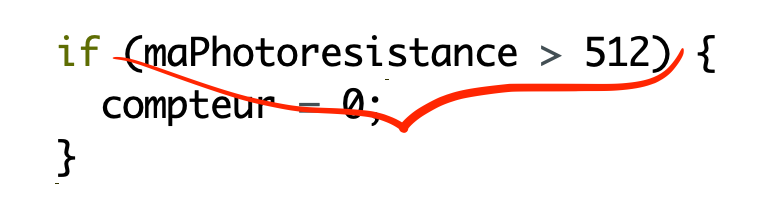 Le code Arduino se lit comme ceci : Si la valeur de 'maPhotoresistance' est plus grande que 512, alors remettre la valeur de 'compteur' à '0'.