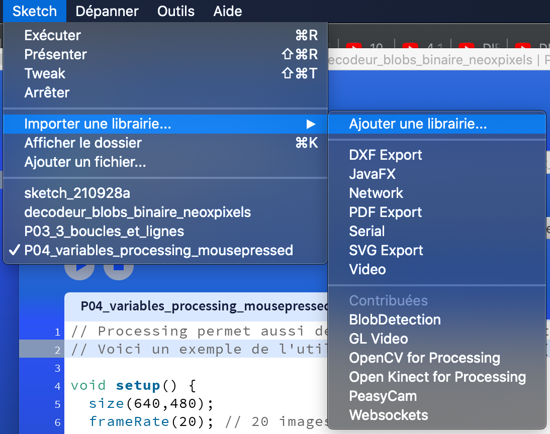 Plusieurs librairies peuvent aussi être installées depuis le menu 'Sketch' :