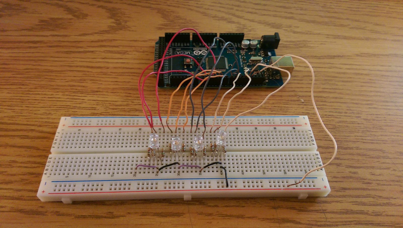 Le modèle Arduino nous permettant d'avoir le plus de LEDs possibles est la Arduino Mega avec ses douze sorties PWN. Tout juste afin de tester quatre LEDs.
