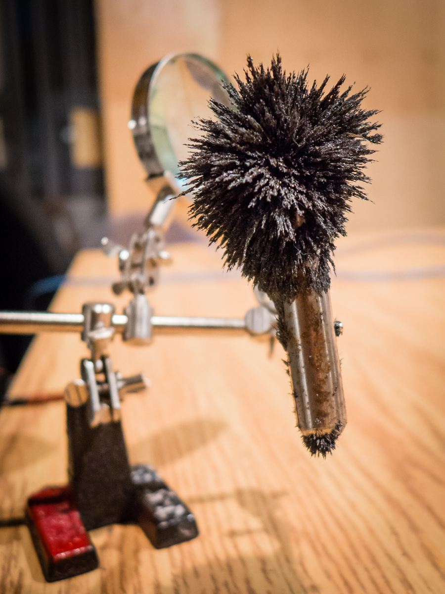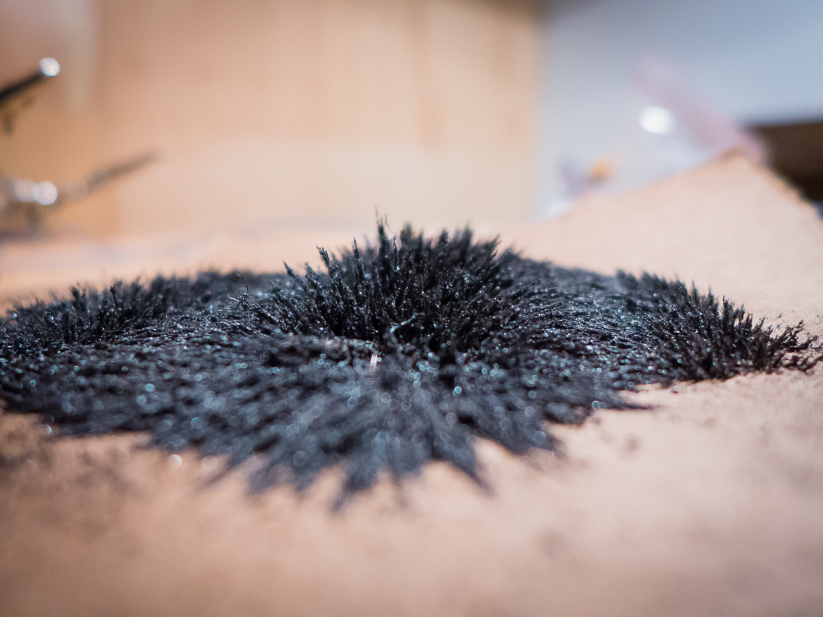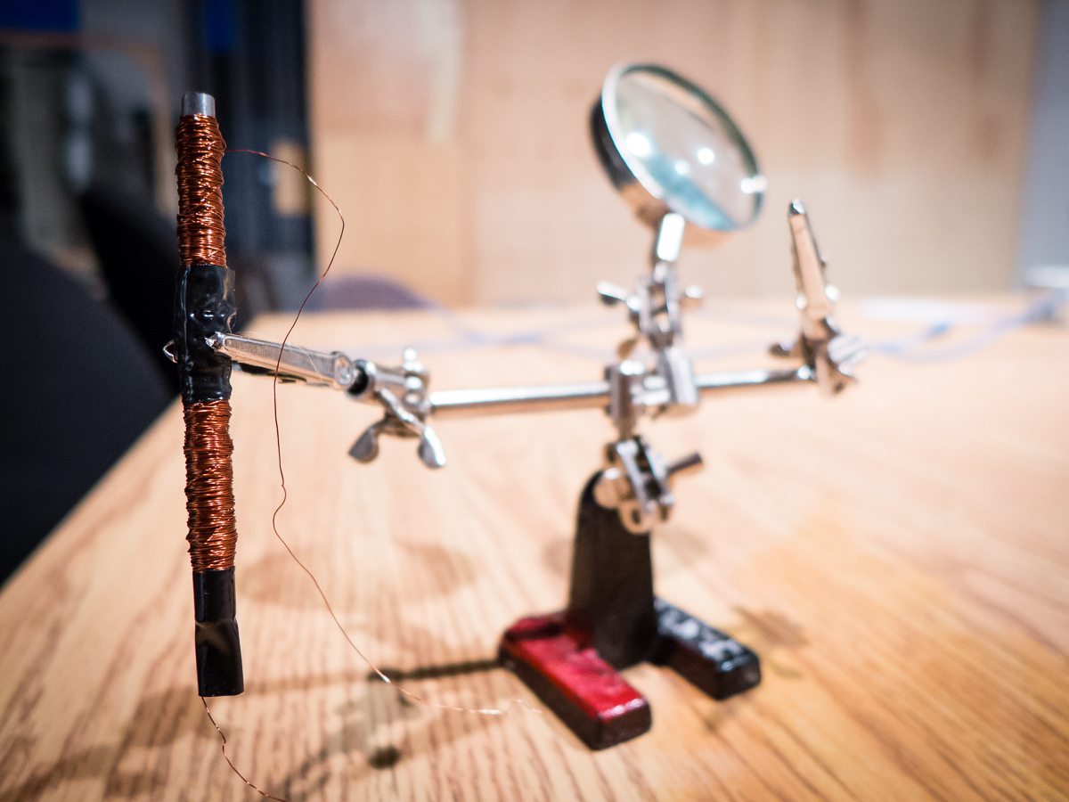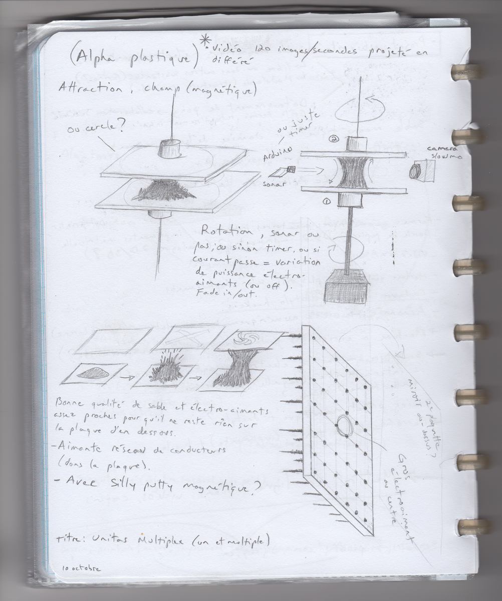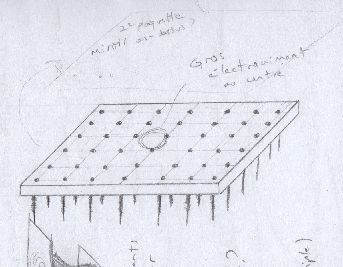 Il voulait réaliser un genre de damier où il y aurait un électroaimant à chaque intersection du quadrillé pour attirer le sable magnétique en différents points et ainsi créer des effets, peut-êtres des motifs, etc. Il se mit alors en chasse, à savoir comment fabriquer un électroaimant. Expliqué simplement, un électroaimant utilise le champ électromagnétique dégagé par un fil de cuivre enroulé autour d'une tige de fer lorsqu'un courant électrique passe dans ce même fil. Le coeur en fer ainsi devient magnétique, tant qu'un courant passe dans le fil.
