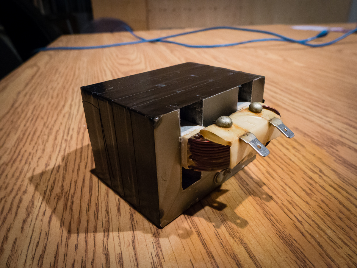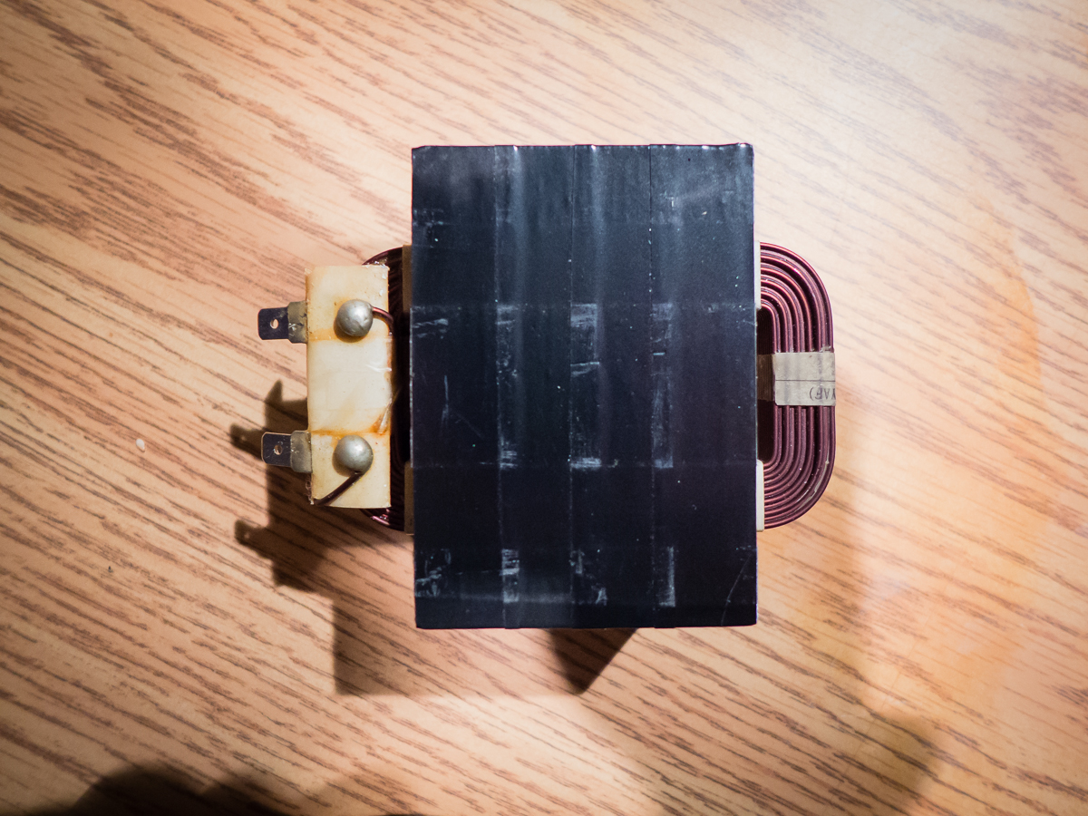 Notre Maxime Boisvert parti alors à la recherche d'un micro-onde. C'est une belle, mais dangereuse aventure qui commença par une belle matinée d'automne […ellipse temporelle…] et il remercia chaleureusement le mystérieux vieillard et reparti avec dans les mains son transformateur de micro-onde. Il fit comme dans le vidéo ; scia le transfo, retira les deux bobines et remit la première :
