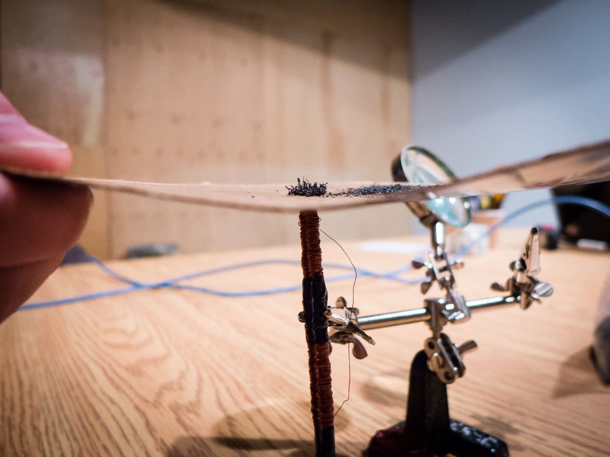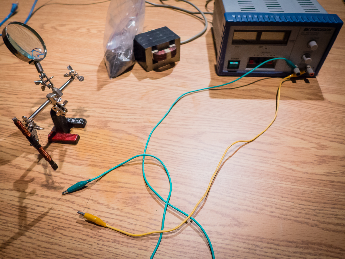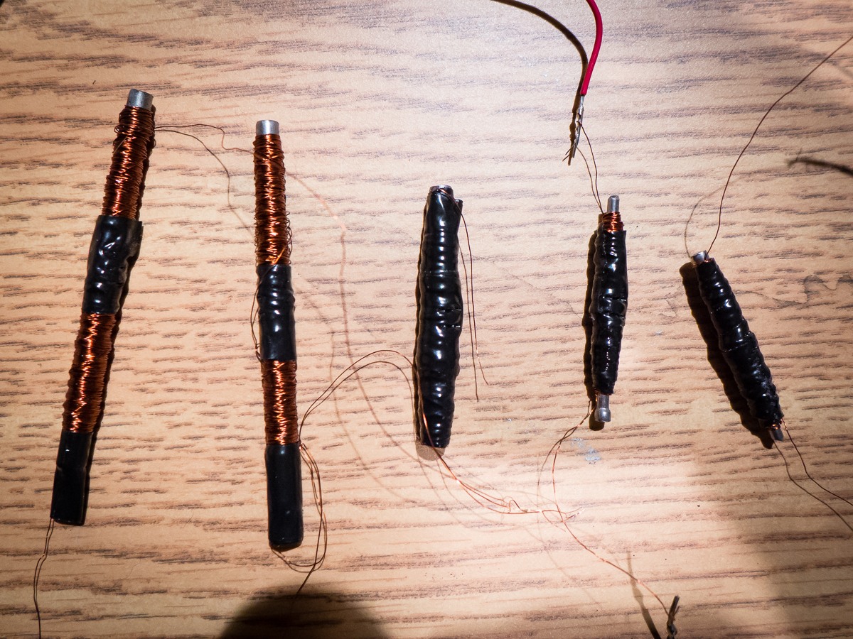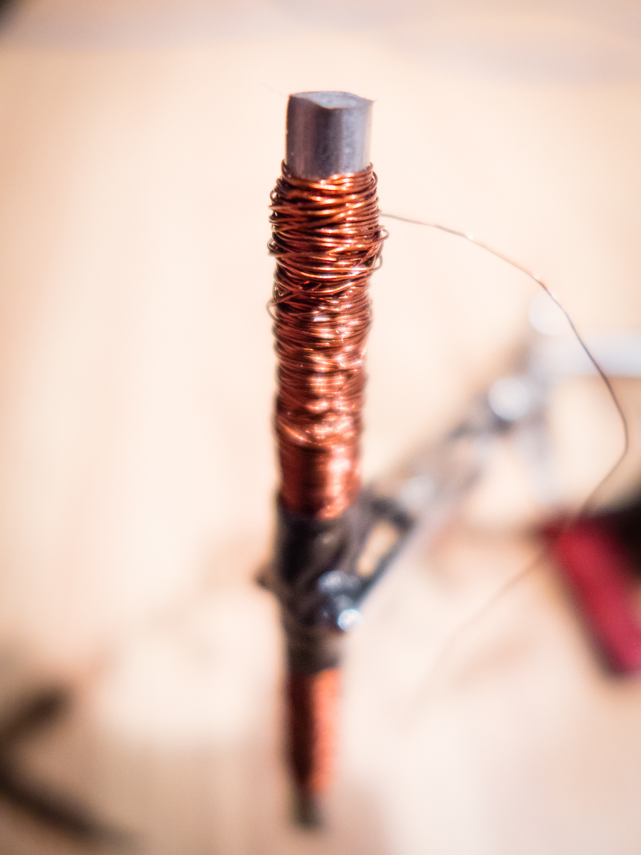mais on lui a dit qu'il fallait du fil émaillé. Un fil de cuivre gainé ne fonctionne pas bien, car l'isolant a environ l'épaisseur du rayon du champ magnétique dégagé. Le fil émaillé est enduit d'une substance qui l'isole, mais c'est un mince film qui n'a pas l'épaisseur d'une gaine de caoutchouc.Il est allé en chercher chez Addison, mais le fil était si fin qu'il ne supportait pas un courant assez fort pour faire un électroaimant digne de ce nom. Pour qu'il ait un effet sympathique, il fallait dépasser 1 ampère, mais il dégageait ainsi beaucoup trop de chaleur. Le pauvre. Après une journée de travail et 5 générations d'électroaimants, voici ce que ça a donné.